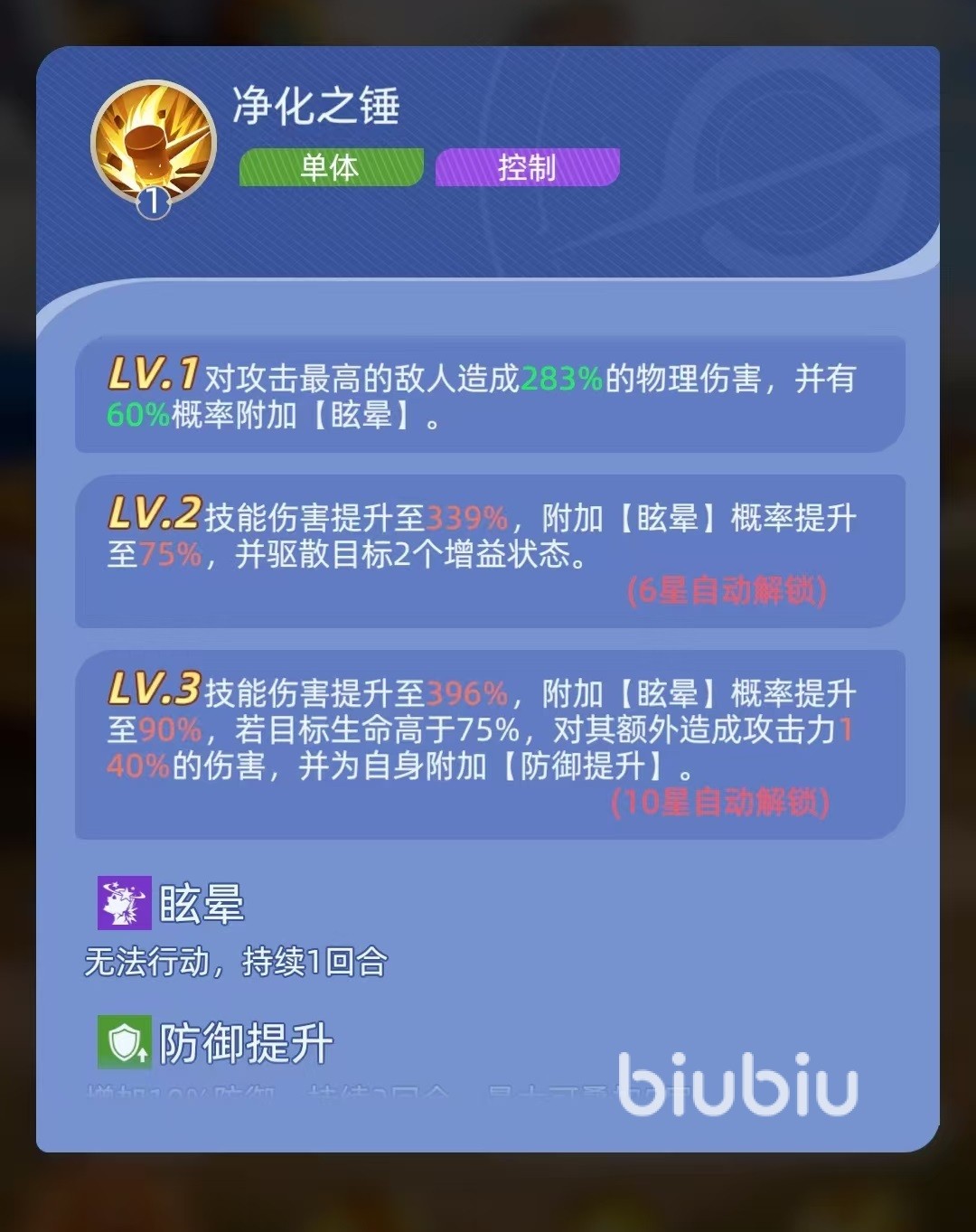 第二个技能在回合开始时可以给我方攻击最高的单位添加守护状态。该单位受到伤害时,会有荣耀之锤来承担部分伤害,这样就可以保护己方攻击最高的核心输出,对方想要快速秒掉我方核心非常困难。最后一个技能是属于强化反伤类型,每次受到伤害就可以储存起来,在使用怒气技能的时候,将吸收的伤害就能释放出去,造成额外输出。这样前排坦克就不再是单纯的挨打,也具有了一定的反击输出能力。作为一名坦克,在阵容中的地位非常关键。