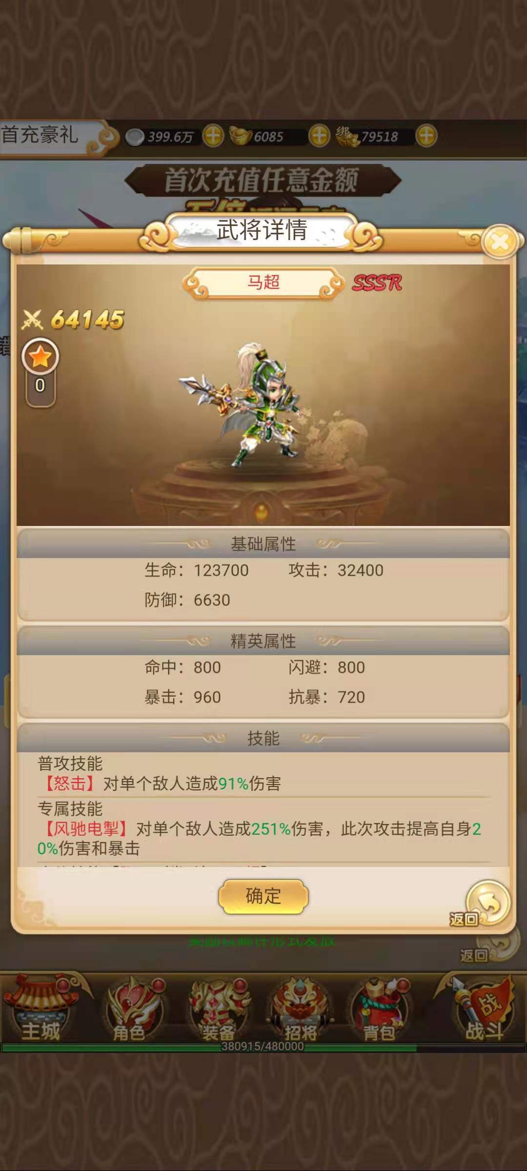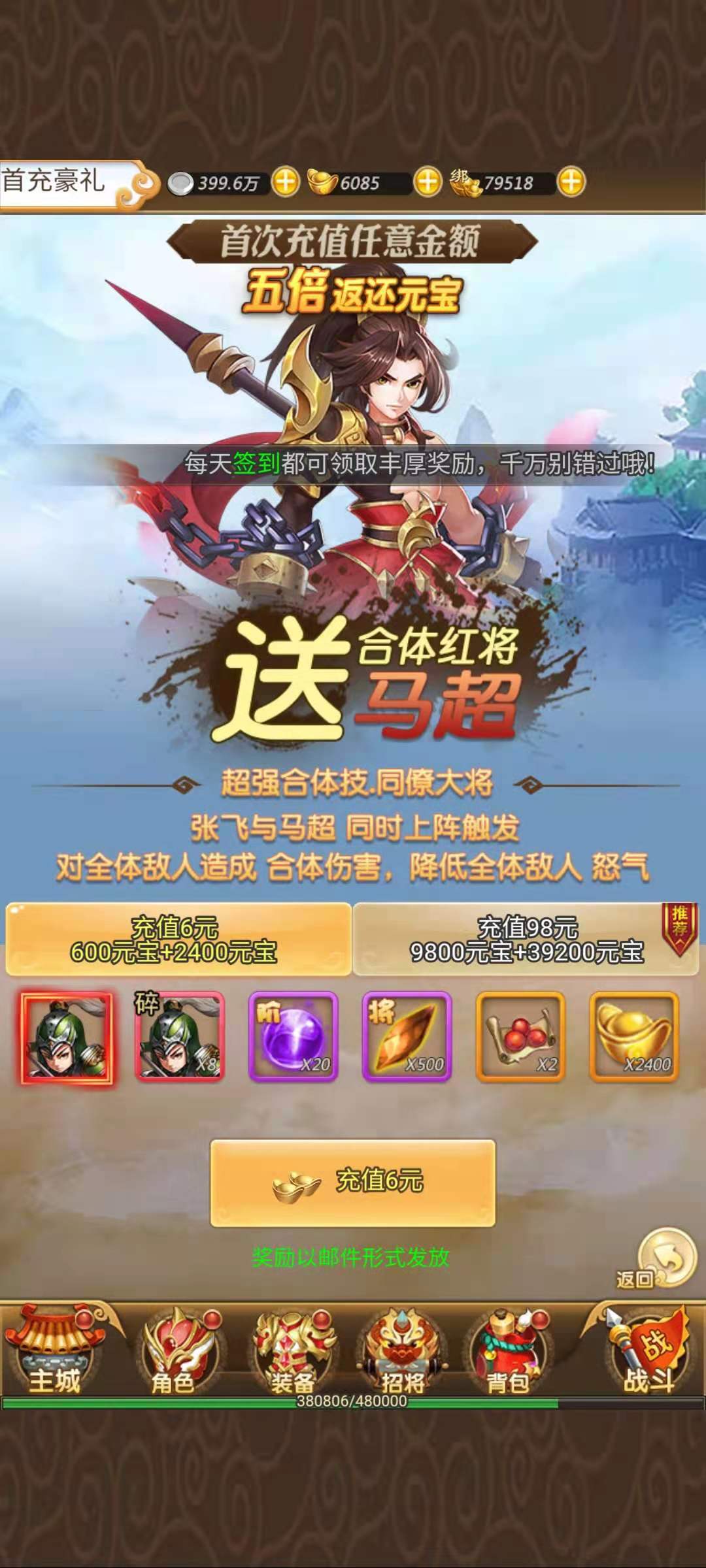 如果运气太差抽不到的话,首充赠送的马超也是一名非常强力的红色武将,只需要充值6元就能领取到马超整卡和碎片,轻松进阶。在后续的闯关过程中,闯到八十关的时候,就能获得吕蒙奖励,直接获得整卡。这些途径都是花费很小的,在特惠礼包中可以购买到特惠红将,可以随机获得一名红色武将,售价是8888点元宝。在七日目标中,也可以购买到特价红将碎片。