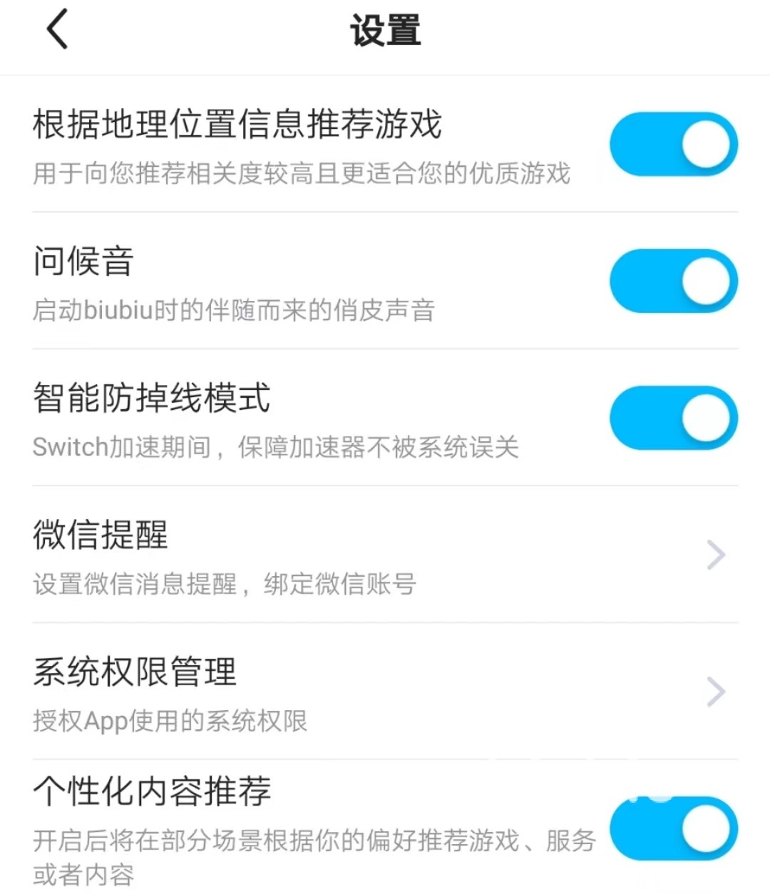 第三步就是调整参数,参数的调整不仅包括加速模式,还有一些个性化的推荐。因为软件是很人性化的,如果大家开启根据地理位置信息推荐游戏的话,那么就能收到系统推荐的一些自己可能感兴趣的玩起来也很优秀的游戏。