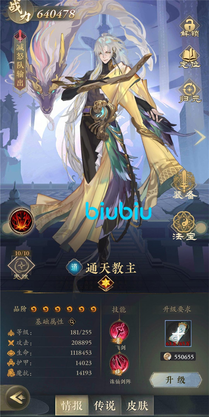 4、道族·通天教主:中毒每回合百分比忽视防御100%攻击的真实伤害,绝对是刷怪利器,在pvp中也是必不可少的一员,另外再加上他的强度非常的高,所以让他成为了游戏中非常受欢迎的角色之一。