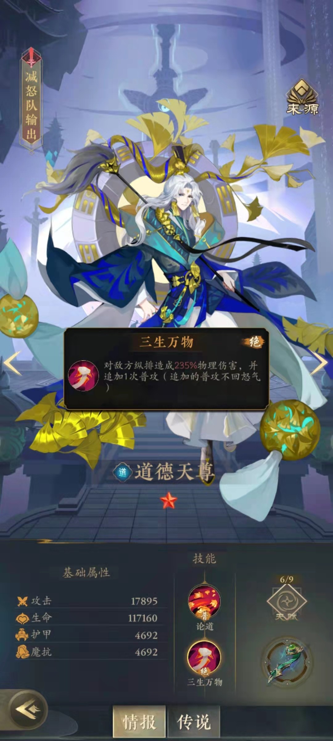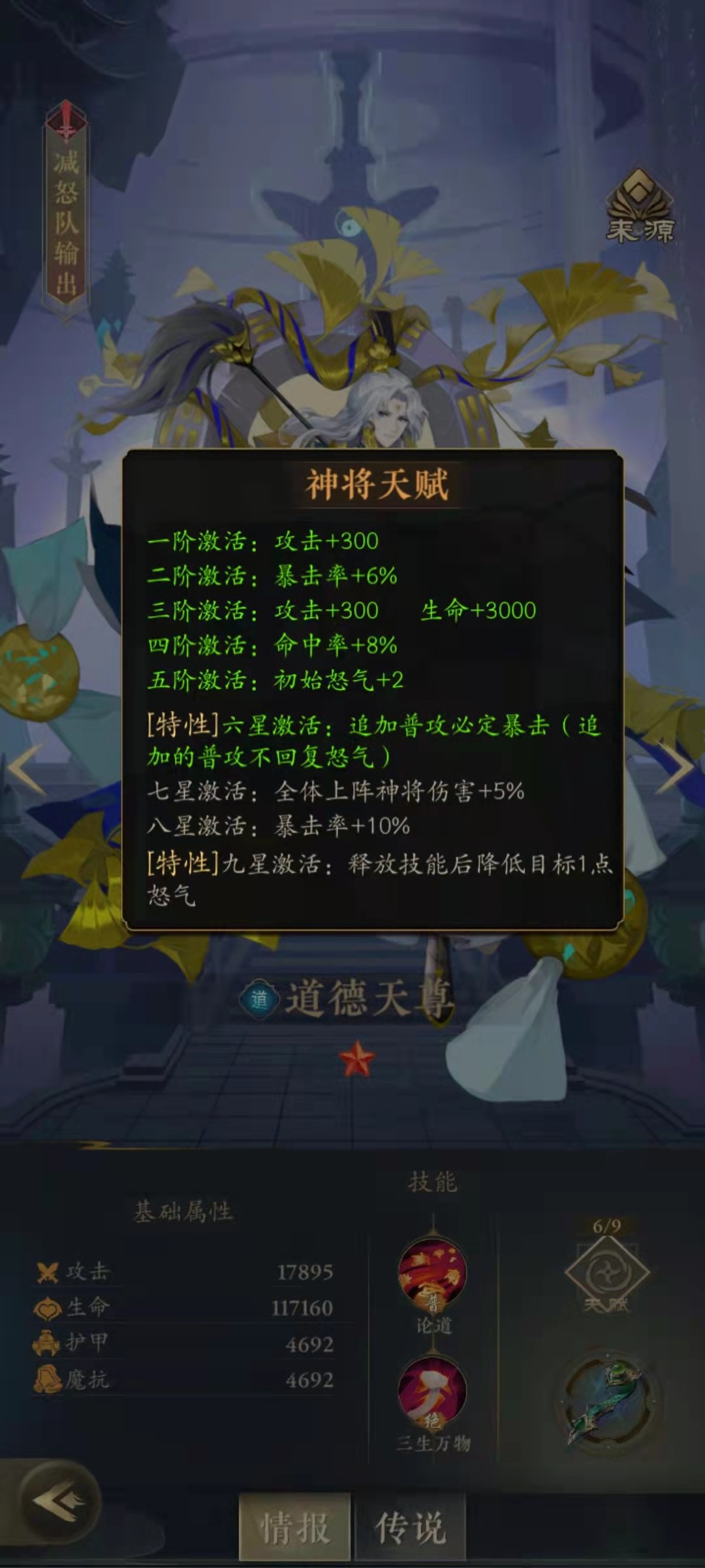 在达到九星的时候,天赋技能使得道德天尊可以在释放技能之后,降低伤害目标的一点怒气,这个效果非常给力,直接将对方的绝技延后释放,为队伍争取来很大的输出空间。所以道德天尊的定位就是在减怒队伍中作为输出,搭配其他的带有降低怒气的英雄,例如孟婆,罗刹,夜叉等,这一套阵容如果承接的顺利的话,对方的技能伤害可以得到很大程度的限制。