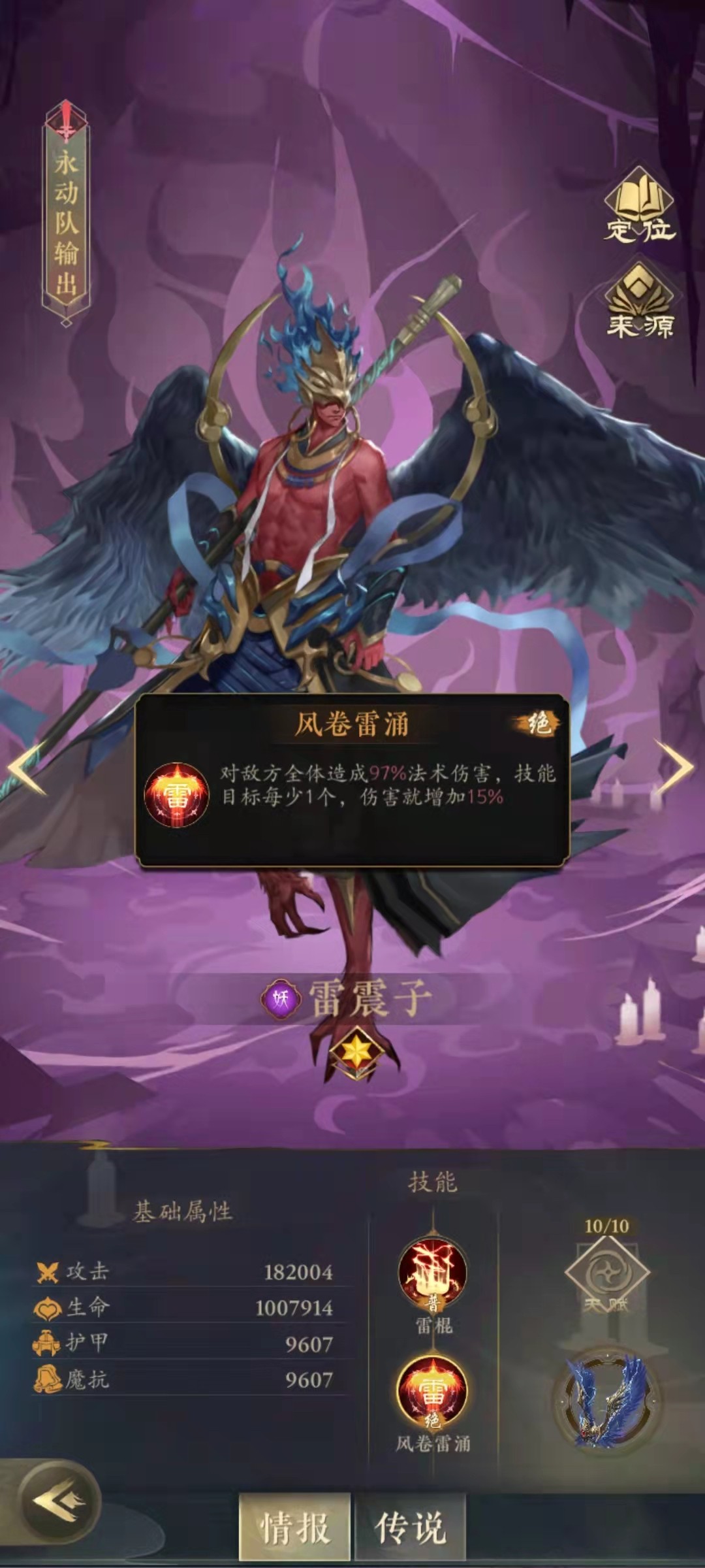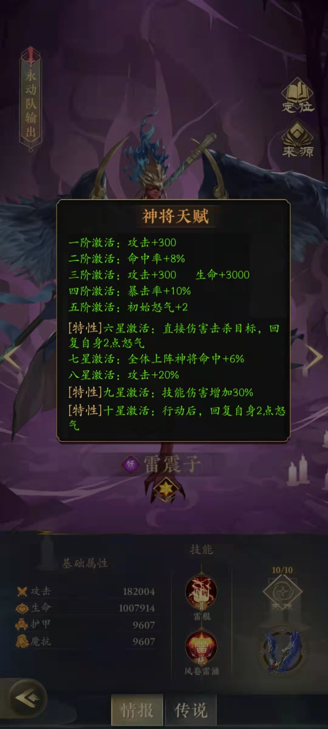 所以雷震子也可以算是全场都有有所发挥的英雄,在前期的时候,技能可以帮助队伍压低血线,后期利用技能的特性来实现收割。除了绝技外,雷震子的天赋技能也非常强力,在五阶之前,增加的都是攻击力,命中几率,暴击率等,非常暴力。