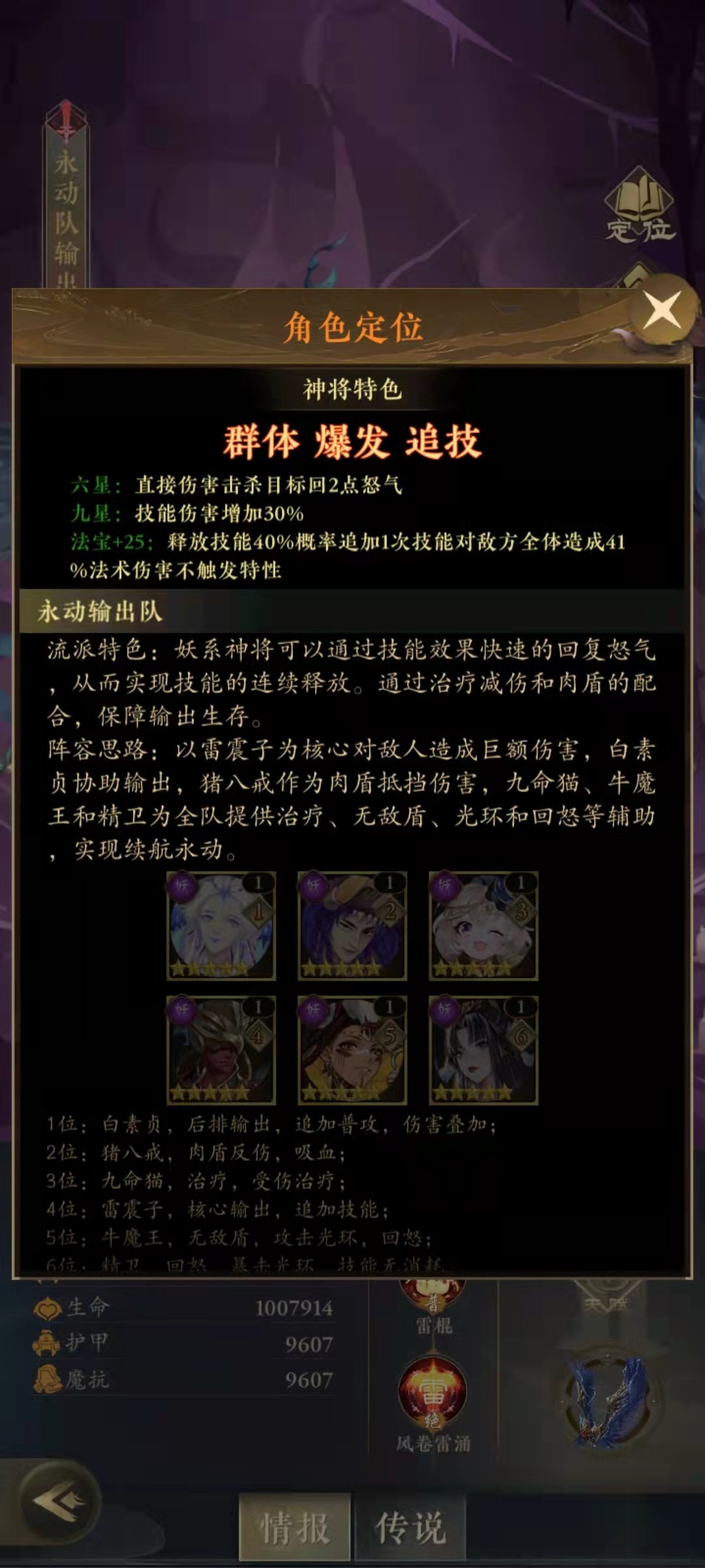 雷震子的第九星的天赋就是增加百分之三十的技能伤害,再加上法宝风雷翅的效果,风雷翅的核心就是在释放技能之后,有几率再次追加一次技能伤害,所以这样一套算下来,雷震子在战斗中可以对敌方造成海量的技能伤害。使用雷震子,可以组成永动机输出队伍,搭配强力的肉盾和辅助,仅仅依靠雷震子的技能就能打出成吨的伤害。