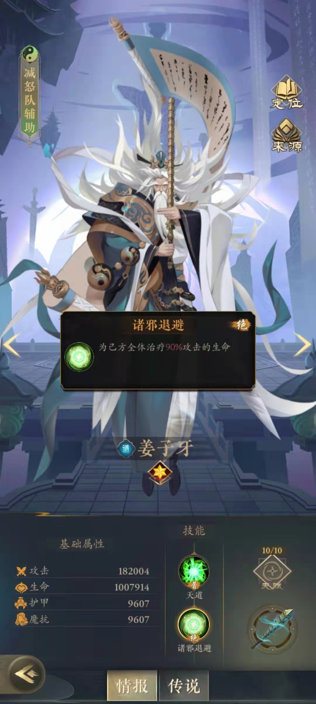 姜子牙的普攻就是恢复技能,可以为己方血量最低的一名英雄恢复生命,绝技诛邪避退的效果是对己方全体英雄进行一次治疗,治疗量初始数值是自身百分之九十的攻击力。姜子牙就是一个非常单纯的治疗英雄,但是单纯并不意味着不强力,从技能加血的效果来看,虽然没有花哨的技能效果,但是对于队伍来说总体治疗量是非常可观的,尤其是选择血量最低的英雄为目标,能够有效地降低减员的可能。