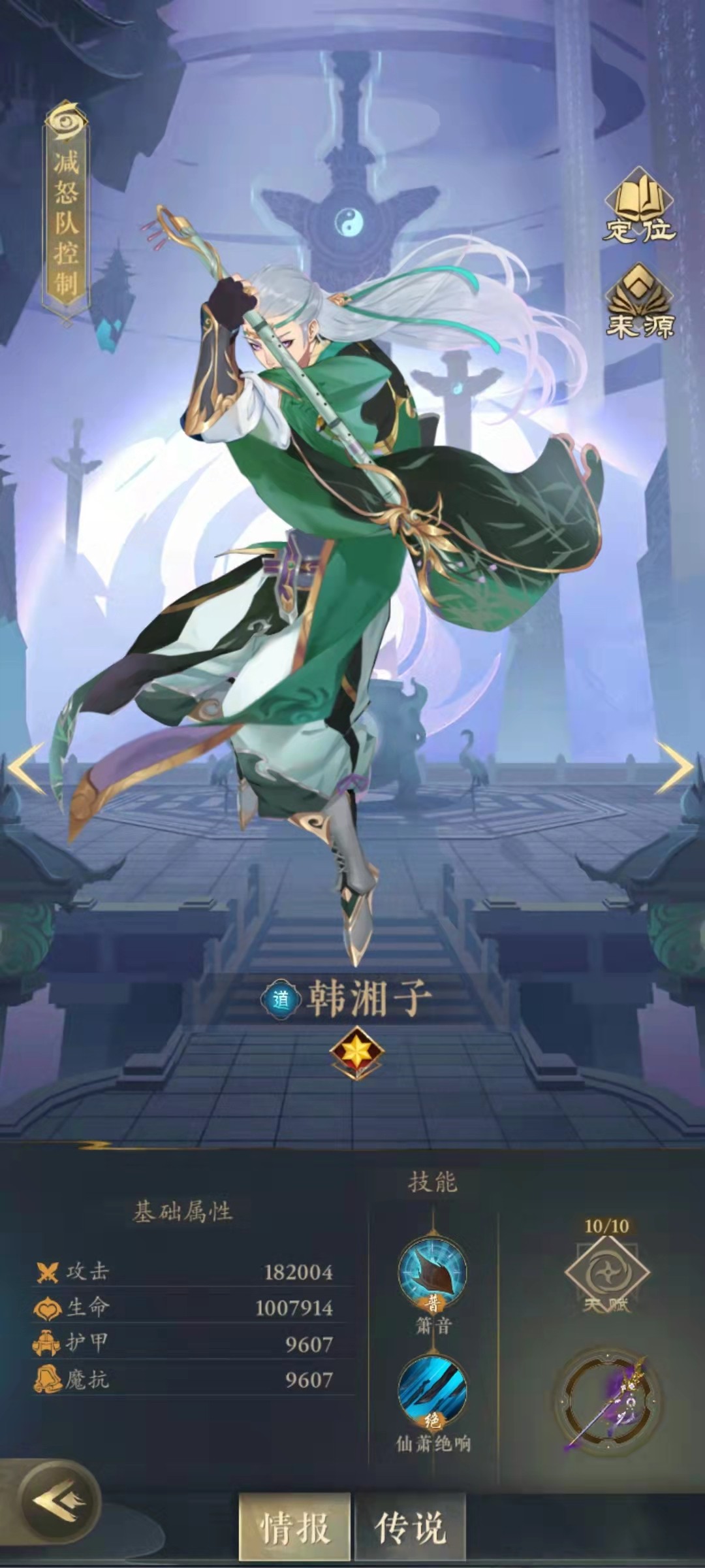 韩湘子的绝技也是全体伤害,并且有几率能够麻痹对方,达到六星时候就可以获得额外的恢复怒气效果,从而更加频繁的释放技能。这一套阵容中,群体伤害和单体伤害都具备,控制效果有眩晕和打怒两个在,能够限制住对方的数名神将,最后在玉皇大帝和韩湘子的群体伤害之下,我们就可以像推土机一样推平对方。