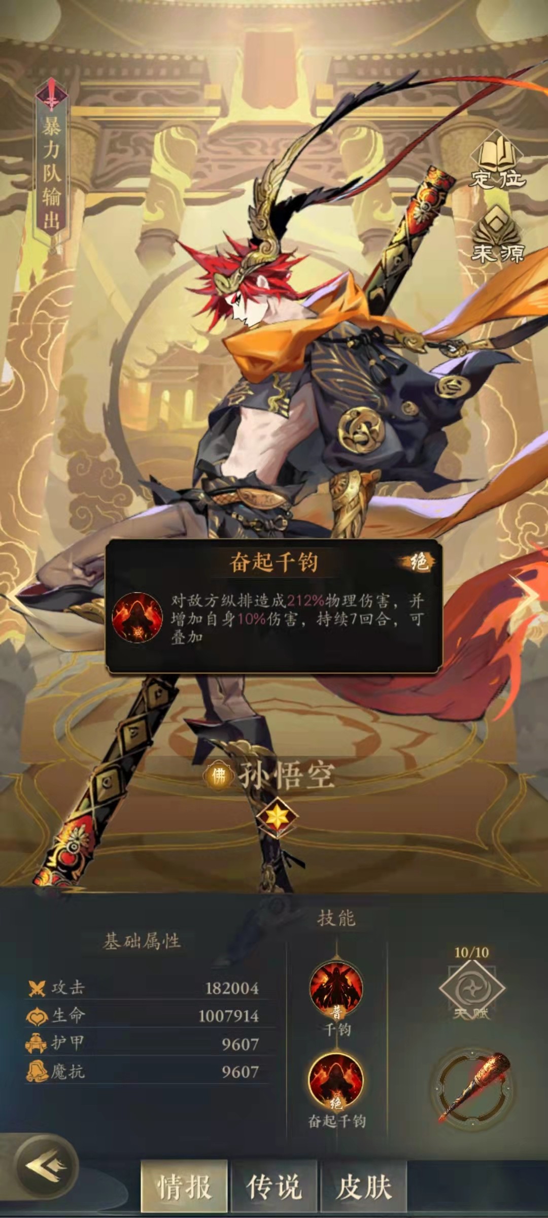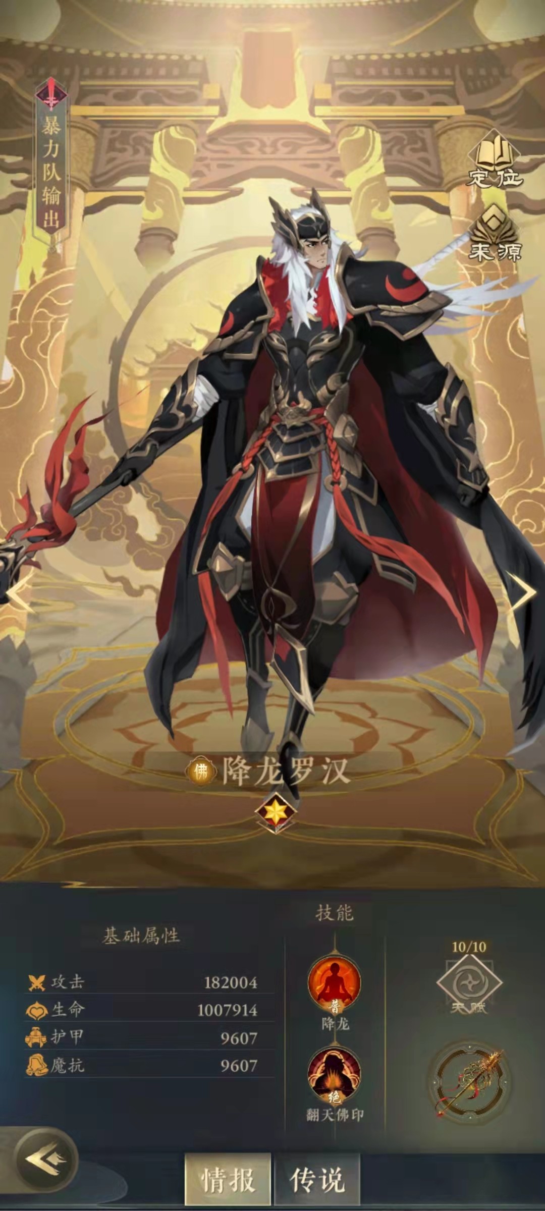 后期的战斗不可能是结合回合就能结束的,所以孙悟空的这个叠加伤害的效果可以使得自身越战越勇,后期收割战斗不在话下。降龙罗汉绝技翻天佛印,效果是可以伤害敌方前排的所有神将,并且在技能使用之后,追加一次普通攻击。降龙罗汉看上去似乎并不强力,但是自身的天赋和法宝使得降龙罗汉也是后期爆发,达到六星的时候,可以使得降龙罗汉每损失一定比例的血量,就能增加自身的攻击力,和孙悟空一样是后半程发力。