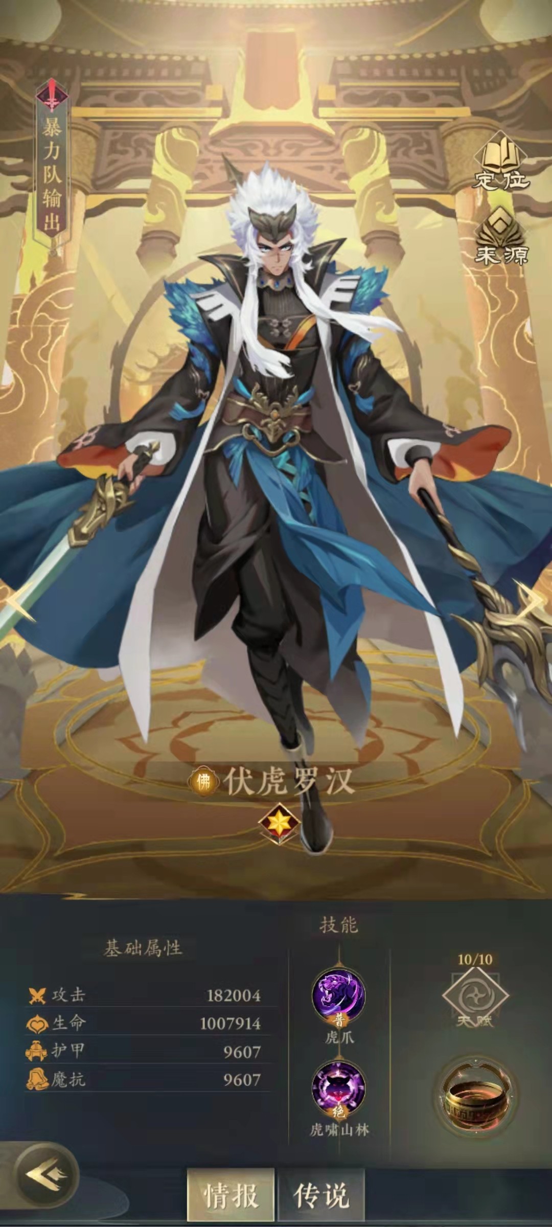 伏虎罗汉的绝技虎啸山林,这是一个很强力的单体技能,能够造成高额物理伤害,并且在技能使用之后额外恢复自身的怒气。能够回怒就意味着能够释放出更多的大招,而且达到六星的时候,伏虎罗汉的第一回合必定会出现暴击,这样在前期压制能力就有了。