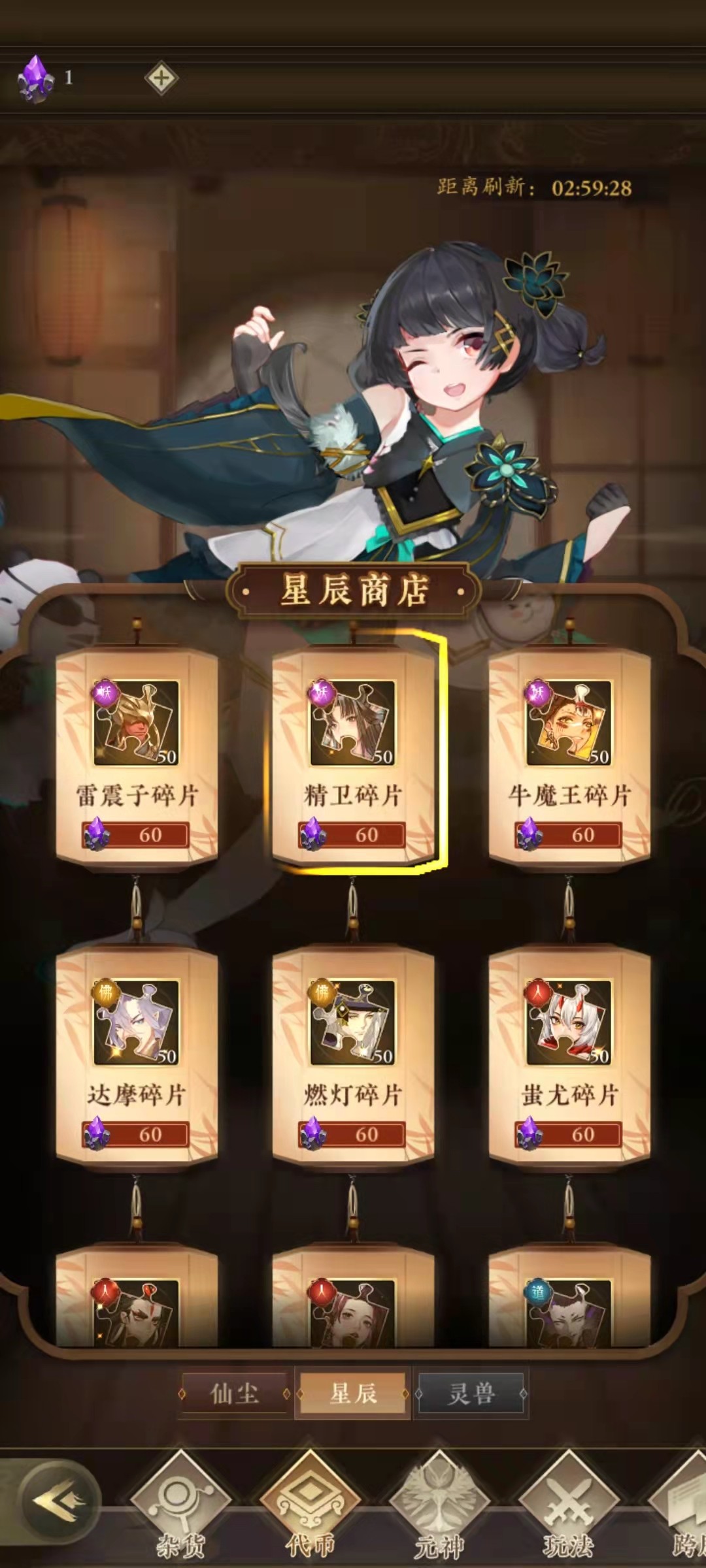 元神商店中购买道具需要使用到元神玉,通过四元阵召唤就可以得到元神玉,在元神商店中出售的都是稀有五星级神将的碎片,精卫的碎片五十枚需要四十五枚元神玉来兑换,五十枚碎片就可以直接合成为一张整卡了。星辰商店需要消耗的是碎辰繁星,可以在山河社稷图,每日礼包,活跃度宝箱等途径来获得,在星辰商店中想要兑换五十枚精卫碎片需要六十枚碎辰繁星。在天宫商店中,兑换五十枚精卫的碎片需要四万五千点战功,战功是在大闹天宫的活动中获得的。