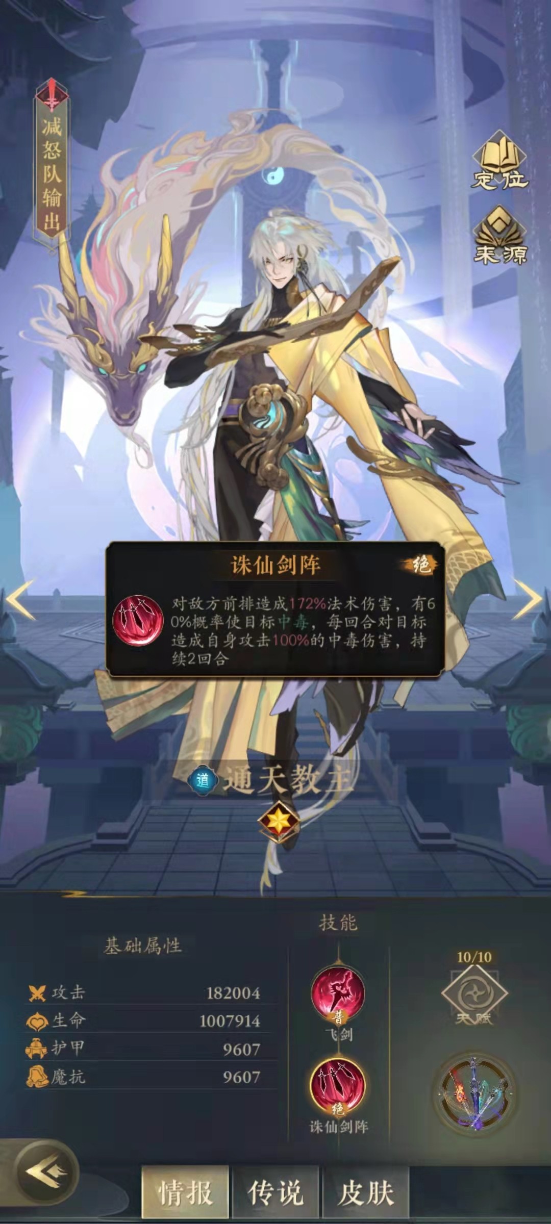 通天教主是道家第一人,自身的绝技诛仙剑阵可以伤害敌方前排,并且附加中毒效果,毒素伤害每一次都是非常高的,敌方的前排在通天教主这里根本就站不住脚。而且通天教主的技能在升星之后,还会附加有降低怒气的效果,使得敌方的前排无法放出技能。