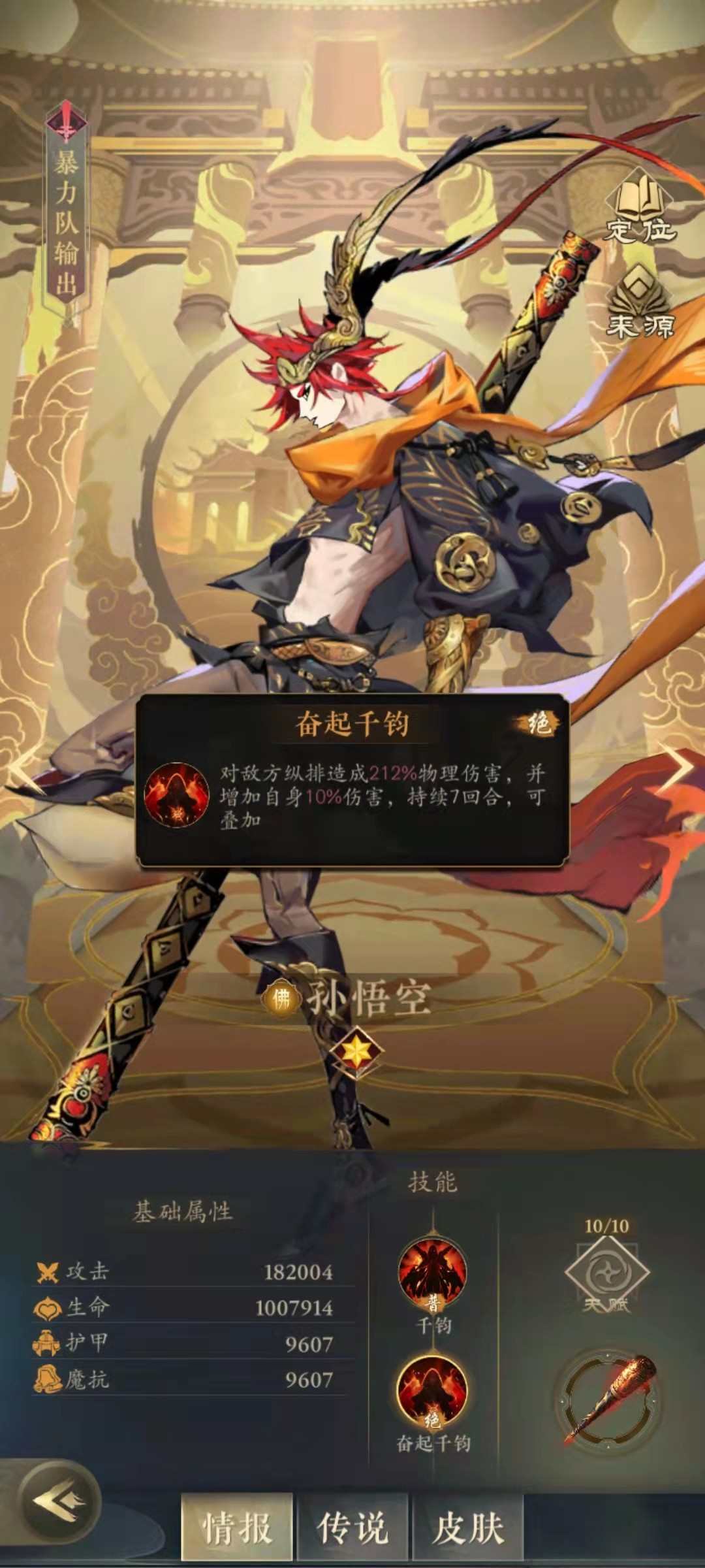 孙悟空号称是斗战胜佛,是佛教中战斗力最强的一个,自身的绝技奋起千钧,可以对敌方的一列纵排的所有目标造成高额的物理伤害,并且在使用技能之后的七个回合之内,增加自身的百分之十的伤害值。这个效果对于普攻和技能伤害都能生效,而且是可以叠加的效果,只要技能释放的频率够快,叠加到三层是没问题的。