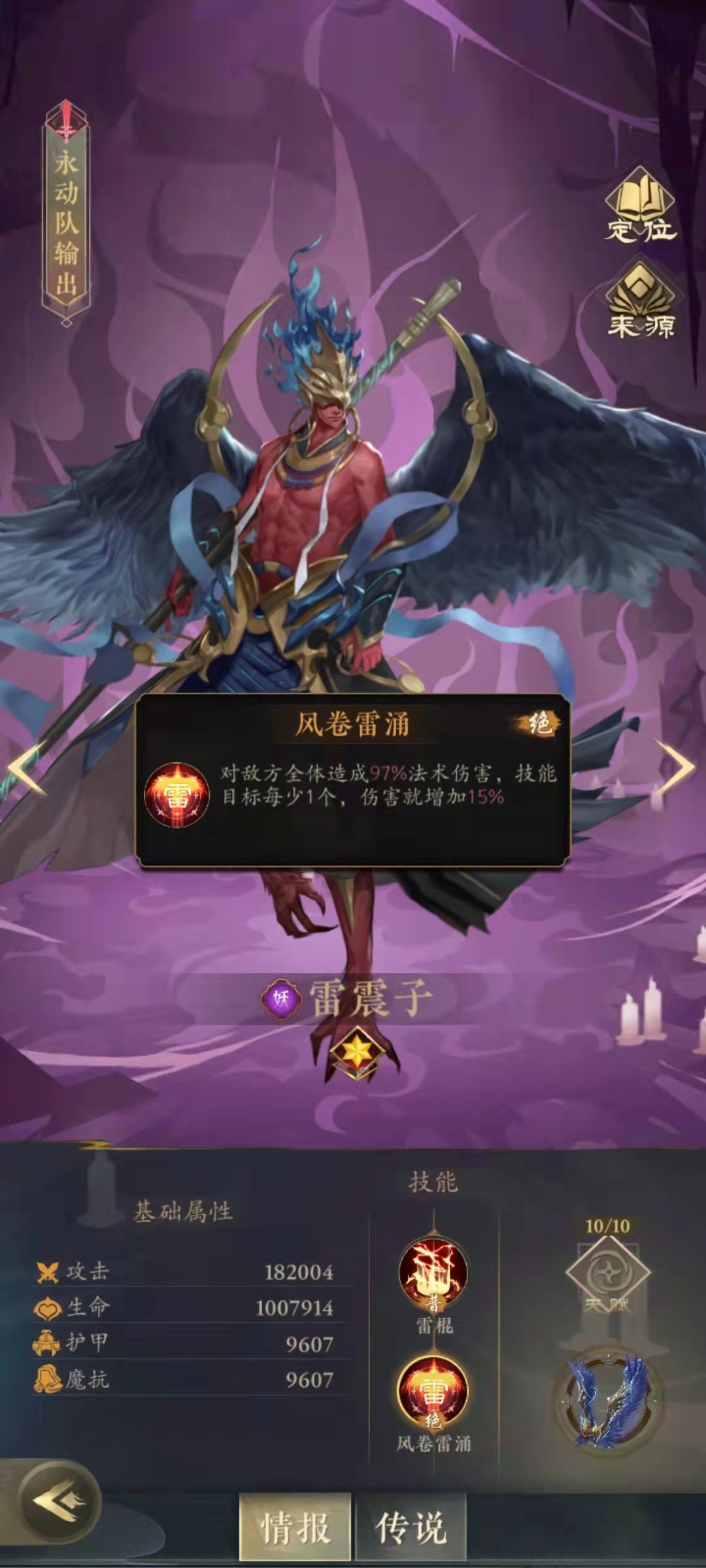 雷震子是妖族中的最强输出,自身的普通攻击就是直接伤害整个的横排,绝技风卷雷涌的效果是直接伤害敌方全体,并且是作用的人数越少,伤害就越高。这是一个非常特殊的群体伤害,在前期伤害的目标多,所以伤害总量高,在后期人数少了,但是单体伤害又提升上来了,所以总量也不会降低。最重要的是雷震子的天赋效果可以在释放技能之后追加一次伤害,还能购获得额外的怒气恢复效果,号称是永动机输出。