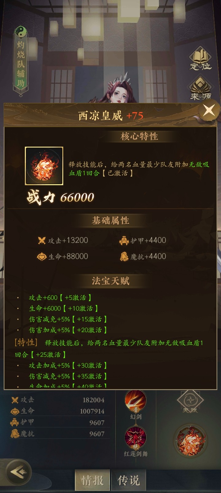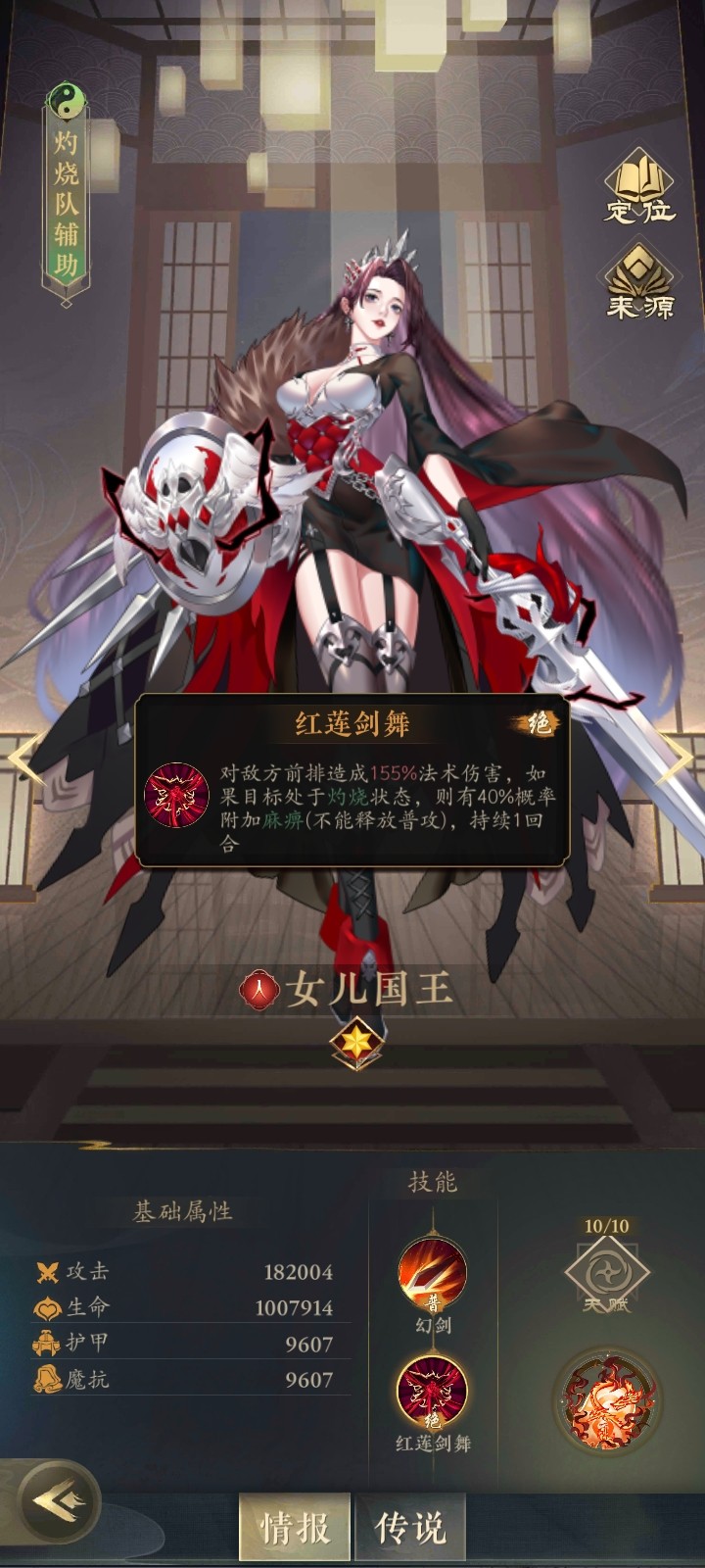 他有两个很高的输出技能,一个叫做幻剑,也是女儿国国王的普通攻击,另外一个,叫做红莲剑舞幻剑的话,能够带来极高的法术伤害,红莲剑舞能够带来极高法术伤害的同时,还有40%的几率可能带来麻痹,能够给予敌人非常沉重的打击。