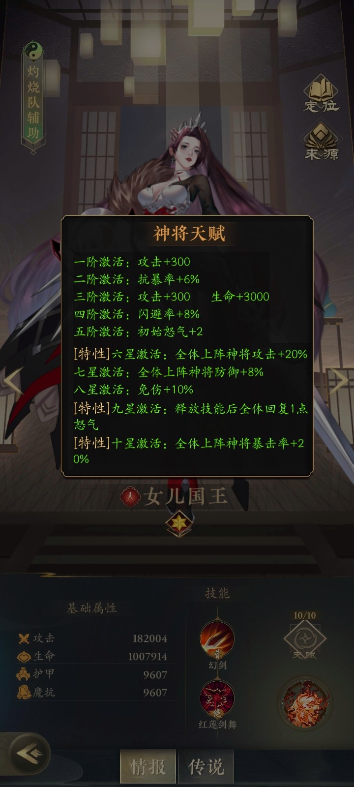 以上就是小编为大家总结的女儿国国王这个神将的技能解析和角色分析,总的来说,女儿国国王是一个拥有极高的法术伤害的辅助型角色,如果好好培养的话,在战场上确实能够起到不错的作用。