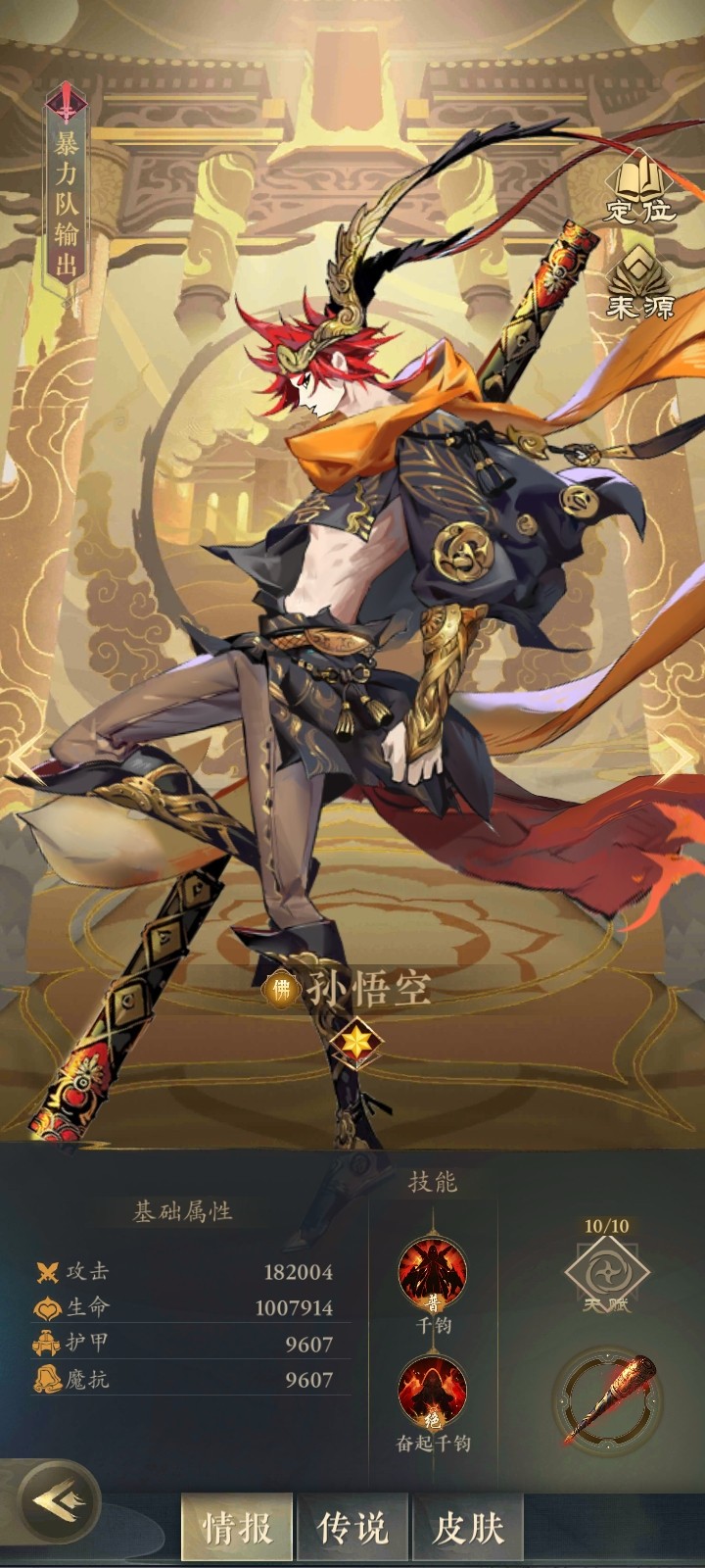 在这款游戏当中,小编最喜欢的角色,莫过于孙悟空了,孙悟空属于佛族,他的技能伤害非常强大,而且每次释放技能都能够提升10%的伤害,他的天赋达到6星之后,输出伤害会增加1010%星以后会增加80%,可以说战斗能力随着天赋的上星非常迅猛的增长,而且每次攻击都会恢复一点怒气值,这个怒气值又能保证孙悟空迅速发出后面的大招形成良性循环。