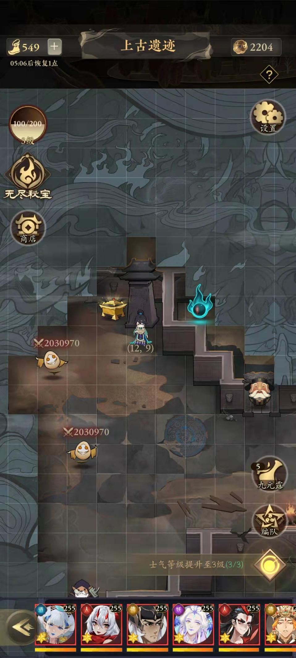 玩家们在进入无尽副本后可以操控小人在格子上移动探索,经过附近的区域和已经探索过的区域都会变成可见的状态,还没到过的地方则是处于不可见的状态。玩家们每移动一格格子就会消耗一点行动力,当左上角的行动力变成零的时候玩家们就不能在副本中进行探索了。行动力每隔几分钟就会自动恢复一点,玩家们也可以直接花费妖晶购买行动力,单次最多购买100点,当日购买的次数越多消耗的妖晶也就越贵。