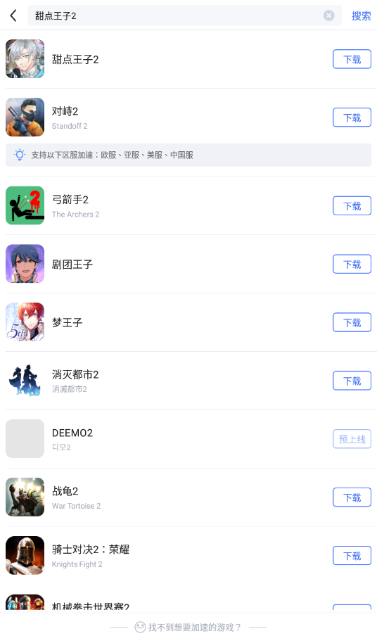 打开Biubiu加速器后,在上方搜索栏中输入要查找的游戏名——甜点王子2,下方就会显示搜索结果,找到游戏之后点击右侧的下载按钮,就可以开始下载了。