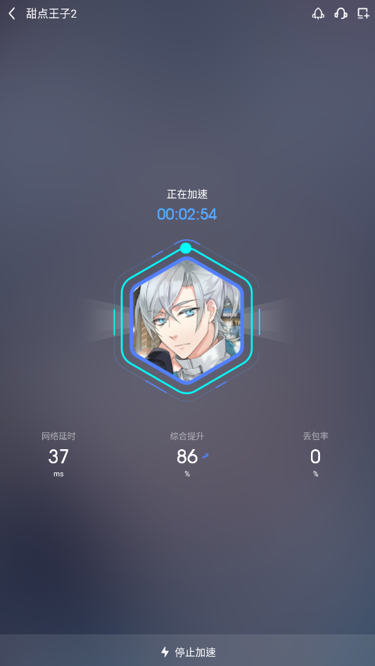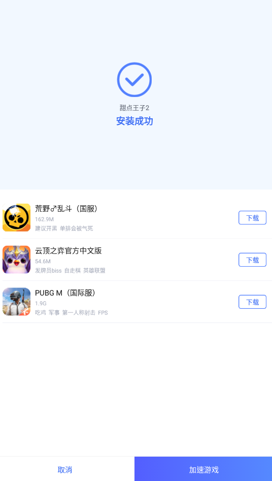 等到安装结束后就可以开始为甜点王子2加速啦。首先根据弹窗提示,点击右下角的“加速游戏”。如玩家想稍后体验,请点击“取消”,后续在Biubiu的加速主界面找到甜点王子2即可,不需要从本地打开游戏。