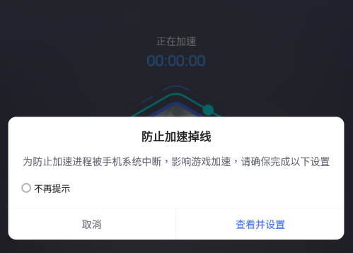 在玩家初次为游戏加速时,会出现下图提示,玩家只需要选择“查看并设置”后,跟随教程步骤一步步完成相关设置,就可以防止加速掉线,保证加速进程流畅。