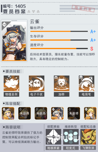 然后一诺作为辅助能力是比较全面的,可以长时间提高我方输出的攻击力和爆伤属性,使得阵容的输出上限会提高很多,之后在坦克的选择就选择云雀,该角色受到攻击后可以降低敌方的整体输出量,最后香取神集可以作为副c弥补下限。