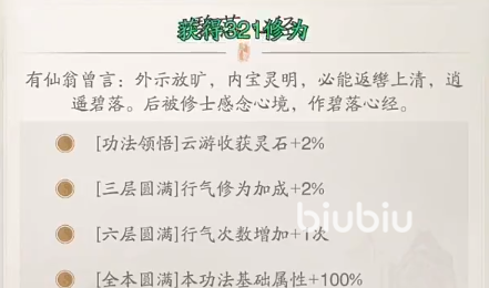 另外当你将其修炼至第一层时,就能让你在云游时可以获得2%的灵石加成,可以让你获得更多的收益。当你将其修炼至三层圆满时,就可以获得2%的行气修为加成。如果你想将其修至6层圆满的话,就能够获得行气次数增加一次。