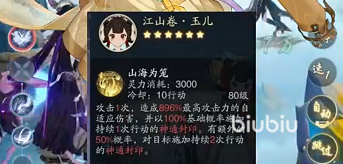 作为一个控制性技能,他的技能叫做山海为笼,用了之后就可以直接攻击一次,并且造成高达900%的最高攻击力伤害。另外还有100%的概率直接封印住敌人的行动,而且有50%的概率是加两个回合的行动限制,让他变得无所披靡。