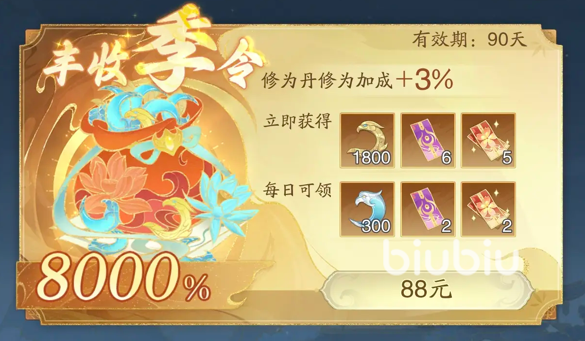 然后还有所谓的大月卡,也就是一次性用了之后就可以获得三个月的加成。季卡的能力更加特殊,能够让你获得3%的丹药修炼加成。也就是说你在炼丹的途中可以获得更多的修为,然后他可以获得的道具每天或者每月都是一样的,只不过数量会变多了。