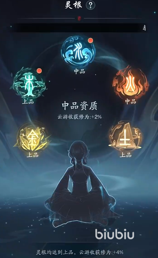 刚开始时我们的资质都是下品,如果想要提升云游时的修炼速度的话就要提升至中品。一旦你突破中品之后,修炼速度就会大大增加,获得2%的云游修炼加成。如果你想要进一步提升的话,就需要将所有的中品灵根提升至上品。不过这个过程相对来说较为艰巨,那大家没那么多时间的话可以先去做任务。