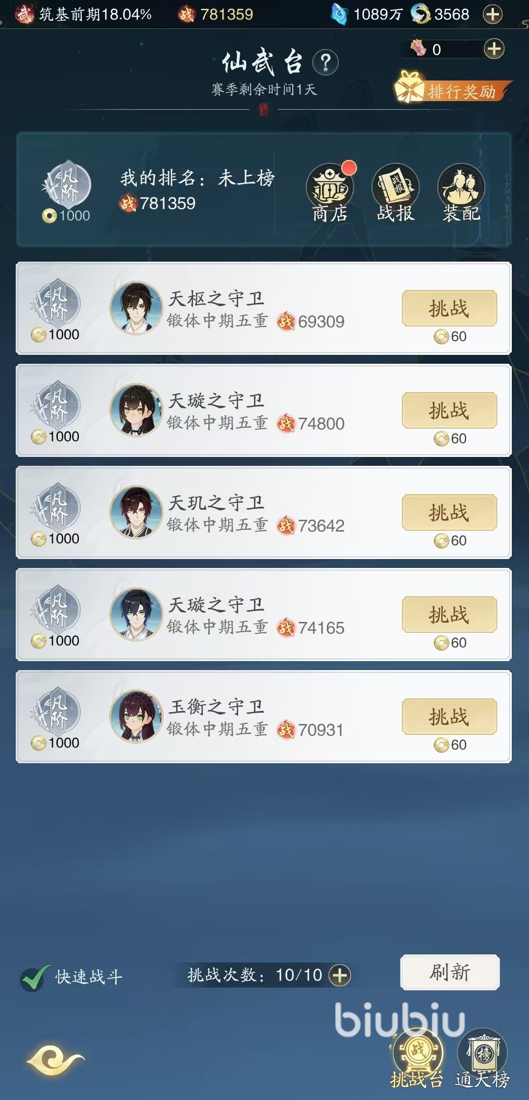 在战斗的时候大家一定要点击快速战斗,这样可以跳过战斗画面直接进行奖励结算,这样一来就可以快速将每天挑战次数全部刷一遍。仙武台每天22点进行当日结算,大家可以在这个时间点之前冲刺一波,这样可以拿到相对较高的排名奖励。至于对应段位的奖励,需要手动进行领取。