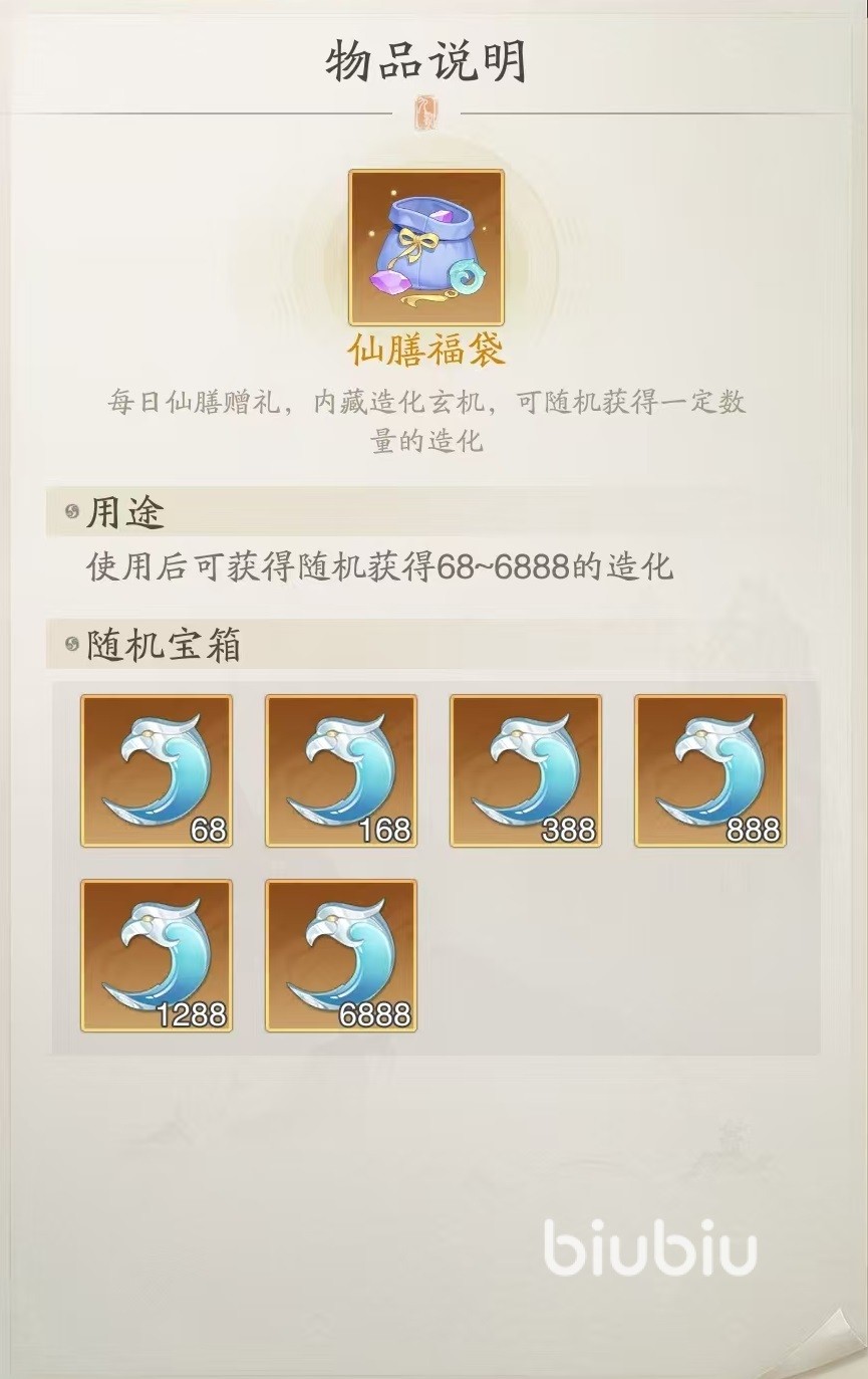 点击进入到洞府中,洞府中有一项活动是每天仙膳,每天在固定的时间段就可以领取到一次仙膳福袋,福袋中就能获得随机数量的造化,从68~6888不等,如果运气够好,一次爆发就足够很多天的使用,所以每天一定要记得领取。从各种途径获取到的这些造化,可以在玄宝阁的造化商店中购买很多有用的道具,包括修为丹药福袋,渡劫需要的避雷符以及各种灵石福袋呢,这里都能买到。