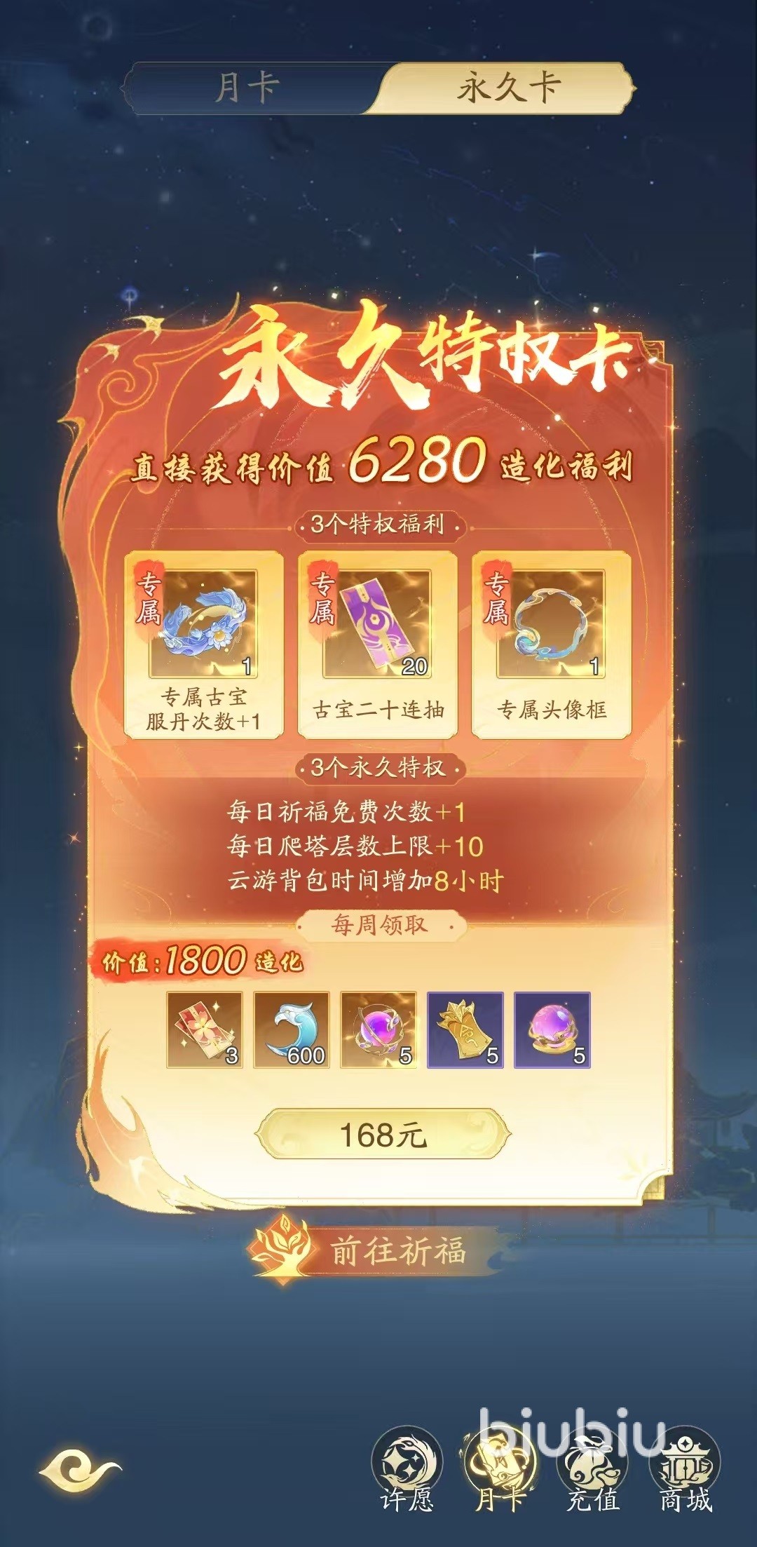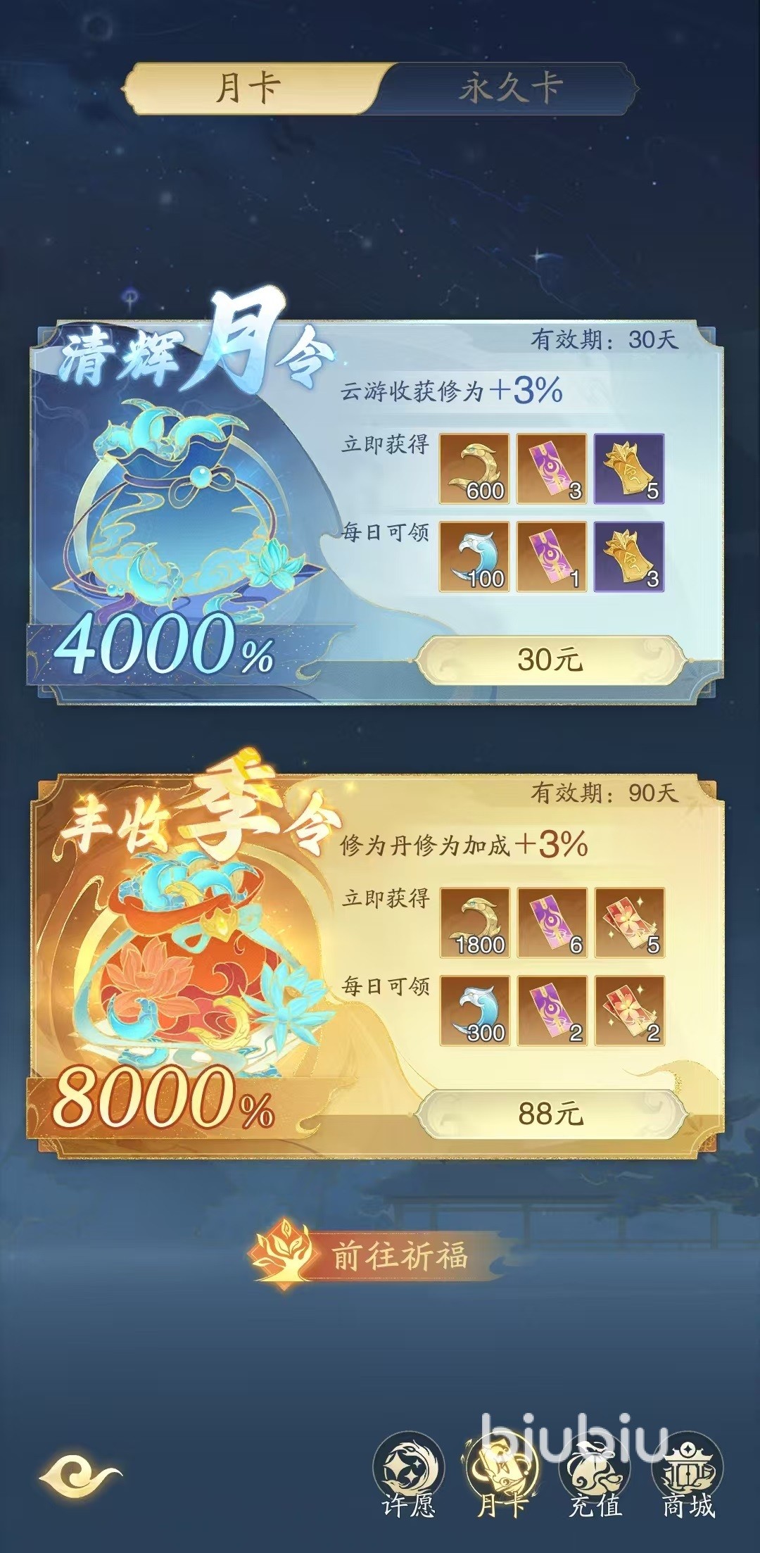 要想获得足够的造化,首先就是月卡和永久卡这两类,无论是开启持续30天的清辉月令,还是开启持续90天的丰收季令,都可以立即获得大量天机奖励。然后每天可以领取到一定数量的造化,30天月卡每天能领100点造化,90天月卡每天能领300点造化。除此之外还有一个永久卡,开启永久卡后每周可以领取600点造化。接下来是充值,充值的时候获取的当然是天机,不过在天机之外,还会额外赠送一定数值的造化点数。