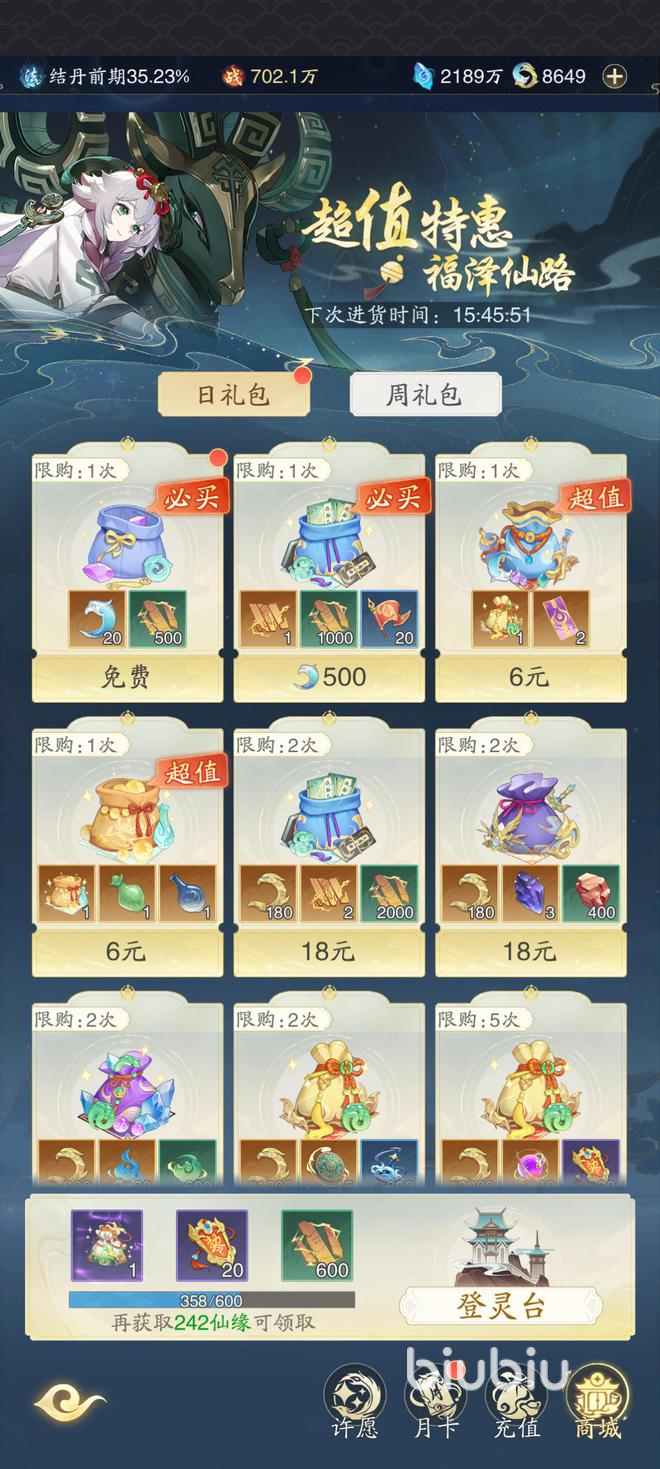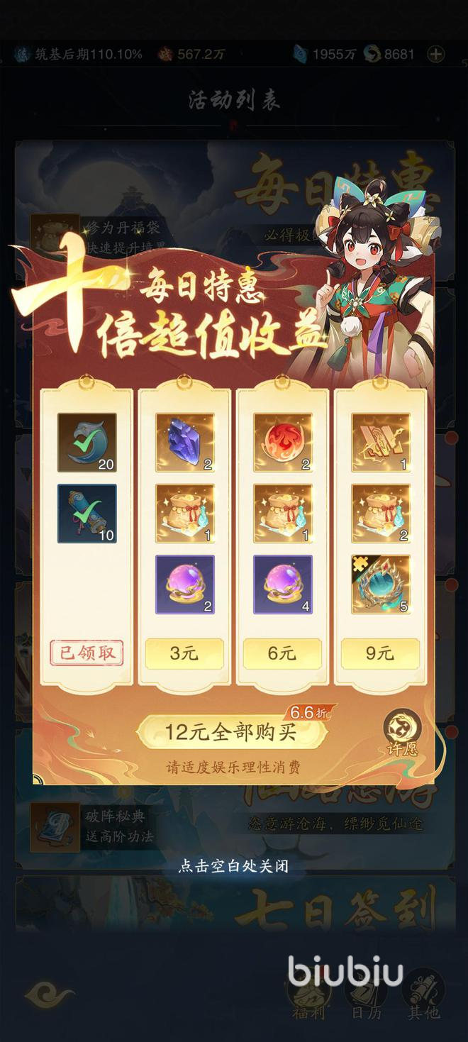 如果是微氪玩家来说的话,那也可以参加每日特惠。每日12元特惠:微氪玩家可选择性购买,提供高折扣道具(如修为丹、造化币)等,不过刚开始建议全都购买,因为都是一些刚需的材料和道具。例如一些丹药又或者材料,都是能够让玩家快速提升修为的道具。
