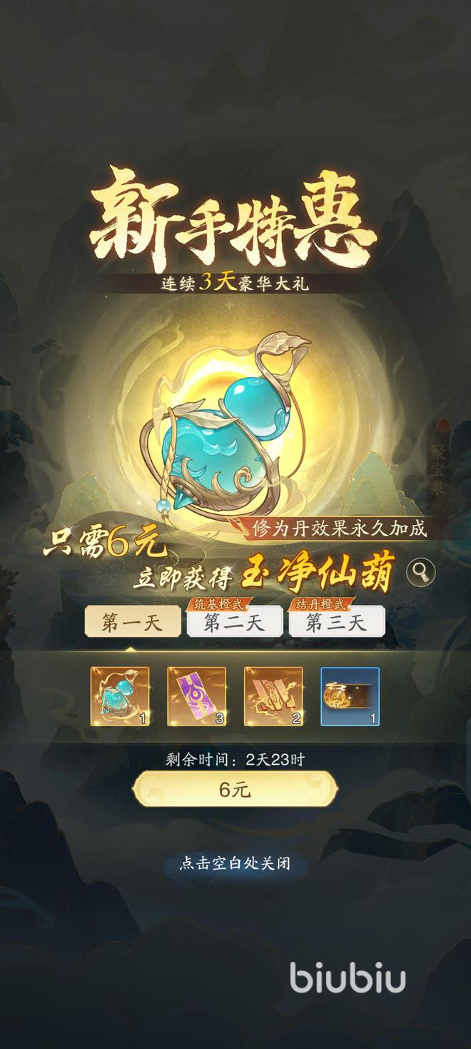 在针对一些刚加入游戏中的新手,也是提供了特惠的充值渠道。你需要充值或者花费6元,就可以连续三天获得豪华大礼。这些包括可以提升丹药修为加成的葫芦,第二天更是可以领取橙色的器灵,第三天同样可以获得结丹期的橙色武器。
