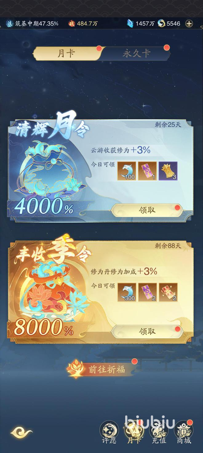 首先月卡这种东西已经老生常谈了,在这个游戏中也不例外。不过这是这里性价比最高的一种氪金方式,只需要花费少量的金额,然后每个月都可以获得定期的奖励。例如提供每日登录奖励,长期收益极高(如月卡收益可达40倍,季卡80倍)。