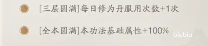 继续升到满的话,则能够获得本功法基础属性直接百分百加满,前面两次的效果也会直接翻倍,也就是得到4%的修为加成效果,每天额外2次能使用丹药。