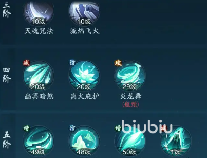 还可以为敌人套上灼烧的debuff,这debuff会让敌人持续掉血可以说就消耗能力来看,这两个火系技能的组合是最强的,不过如果大家不想打消耗战的话,那可以将主打灼烧的离火灼焰换成幽冥暗煞,这是一个纯伤害的法术。