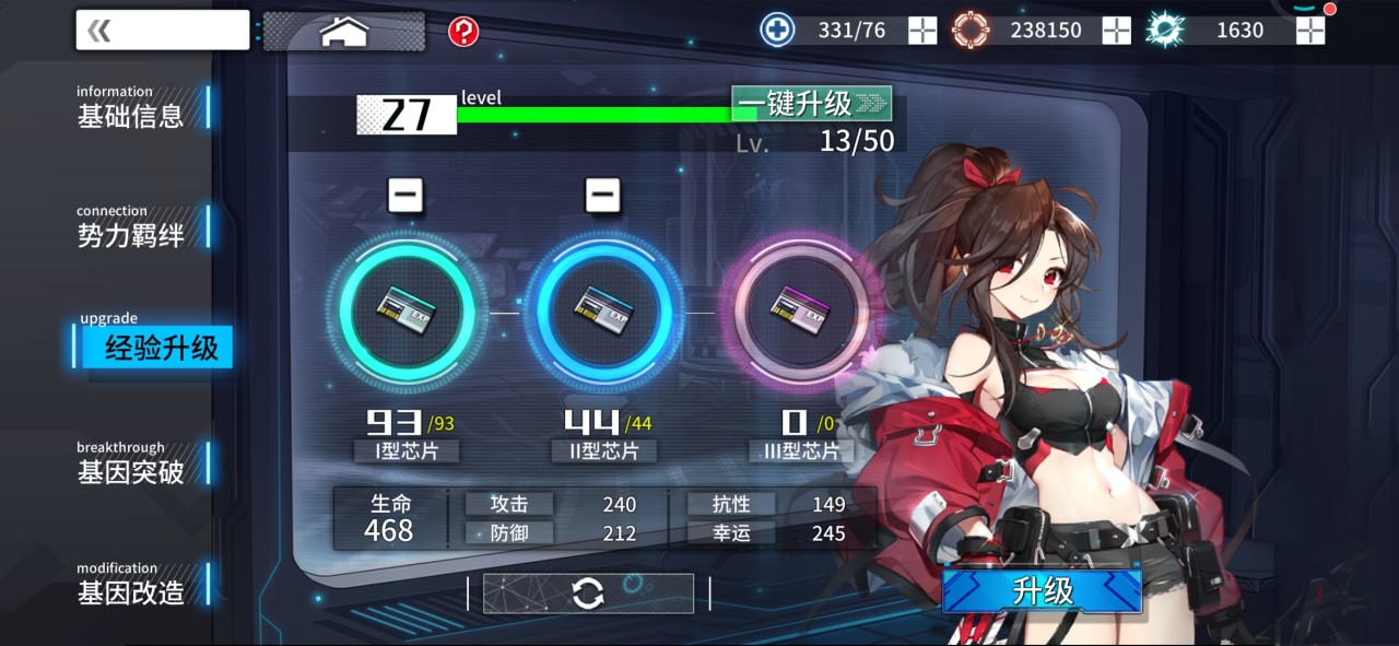 最简单的过关方式应该就是提升角色等级了,可以使用之前关卡中累积的芯片提升角色等级,这个游戏比较人性化的一点就是可以一键升级,省去了很多麻烦。角色等级提升的同时,她的属性值也会随之增高,从而可以打出更高的伤害。一旦角色等级上去了,还用得着担心过不了这关吗?