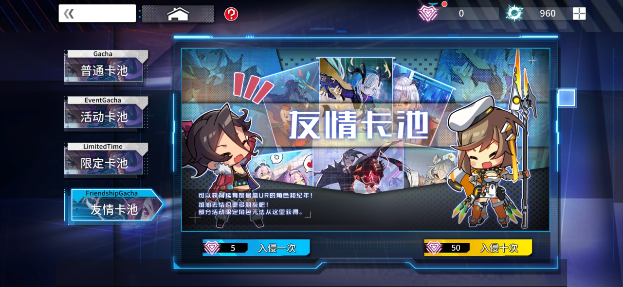 友情卡池:使用5友情卡点可以入侵一次,50友情卡点可以入侵十次。