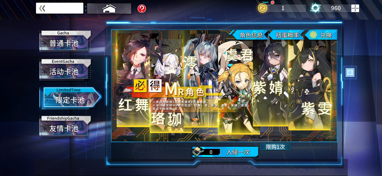 限定卡池必得MR角色:红舞、珞珈、澪、虞君、紫婧、紫雯,限定卡池限购一次,使用MR限定入侵芯片,通过购买获得。