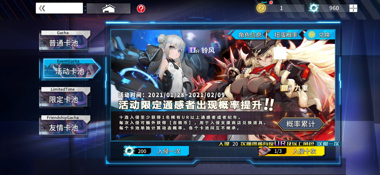 普通入侵:十连入侵至少获得1名稀有度UR以上的通感者或者纪年。