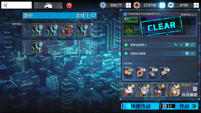 从敌方信息我们可以知道有5个LV5的敌方单位,4个风动属性的敌方单位和1个热能属性的敌方单位。胜利条件是击败全部敌人,获得10点经验和30点核心秘匙;特殊条件是2回合内通关,获得30点核心秘匙。掉落的物品有必掉的750点信用点,1个I型芯片,1个P.T.HID卡,还有一定几率掉落2个祝福花束。