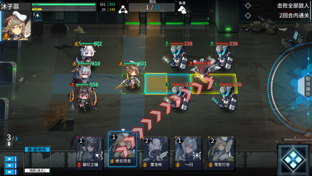 我们可以将沐子菲前进一位,然后使用绝云突击攻击中间的敌方单位。(绝云突击:沐子菲向指定方向突进,并对路径上的敌人造成物理伤害。)