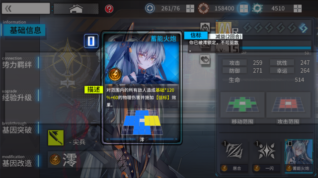 蓄能火炮:电磁技能,对范围内的所有敌人造成物理伤害并附加【信标】减益效果2回合,该技能不可驱散。