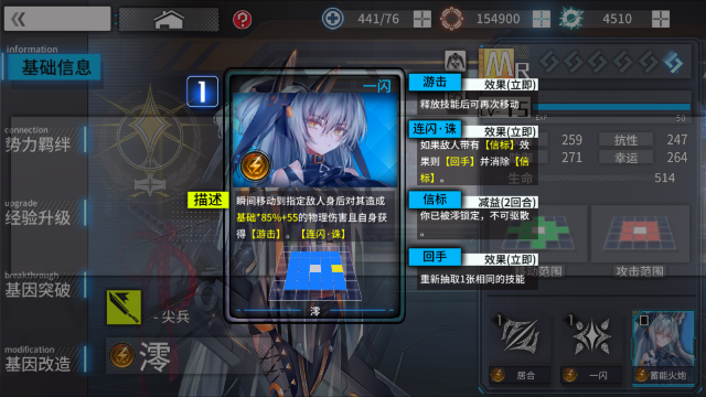 一闪技能:电磁技能,瞬间移动到指定敌人身后对其造成伤害,自身获得3个立即效果,①立即效果【游击】,可以再次移动;②立即效果【连闪·诛】,是一个连动技能,只有敌方单位身上有信标时才能够触发从而获得回手效果;③立即效果【回手】,当敌方单位身上有信标效果时,重新抽取1张相同的技能。