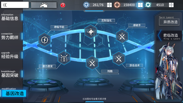 君临改造:①君临节能:君临能量上限降到10%;②潜力激发:君临技能伤害提高10%;③克制强化:君临技能异质克制效果提升15%;⑤残酷:君临技能只击中1个敌人时必定暴击;⑦游击战术:君临技能释放后自身获得【游击】效果;⑧爆破手:君临技能暴击伤害+30%。每次君临改造都会耗费一定的信用点和MR型BCI,君临改造会强化澪自身的作战能力。