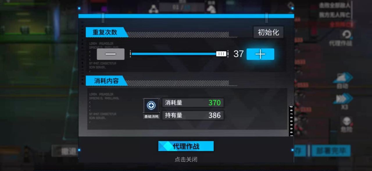 代理作战:就是类似于自动作战的一个玩法,消耗行动力挑战关卡,每次玩家设置的代理作战次数不能超过自己拥有的行动力总量。