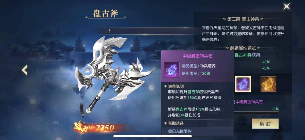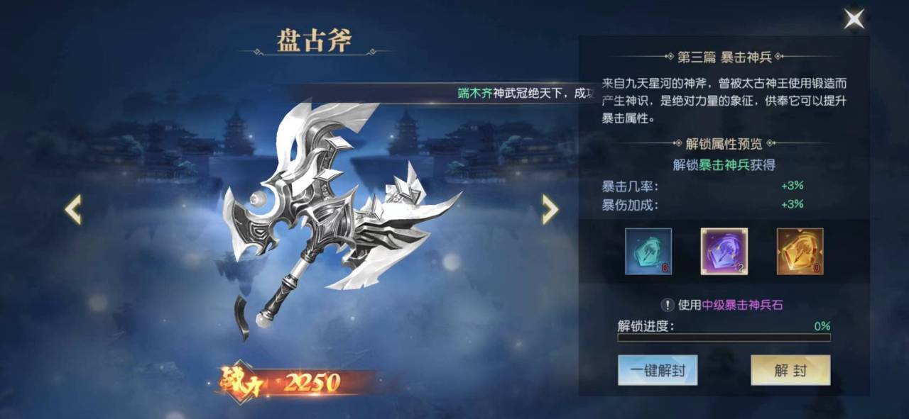 对于解锁这些上古神器,我们需要在神器界面中操作,点击进入神器界面,选择上古神兵,移动到暴击神兵,是一把盘古斧,来自九天星河的神斧,是绝对力量的象征,供奉它可以获得提升暴击的属性。我们在这里可以看到解封的选项,但是解封需要一些对应的材料,需要暴击神兵石才可以解封,而且需要一定的数量当百分比达到100%的时候就完成了解封。