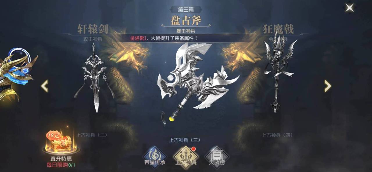 神器上古神兵中有四件神器,分别是生命神兵,攻击神兵,暴击神兵和会心神兵,分别代表着生命攻击,暴击和会心,供奉这些神器可以给角色加上对应的属性,这些加成可是一个不小的加成,后期锤炼好了之后会对战斗力的提升有很大帮助。