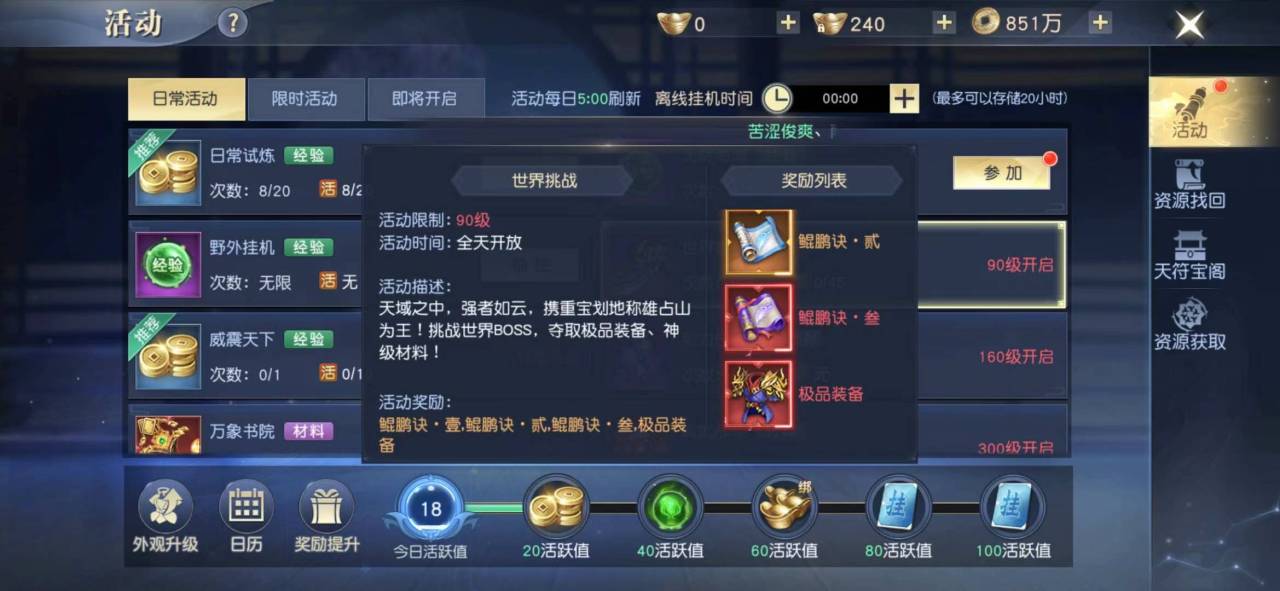 世界挑战强者如云,当你有一定等级达到一定战斗力的时候可以来这里试试身手,活动限制等级为90级,在这个活动下要挑战强力的世界BOSS,90级只是门槛要求,事实上这个副本等级强度越高越好,毕竟打世界BOSS没有那么容易,后期可以获得的奖励上面有鲲鹏决这类高阶材料,更重要的是有机会获得红色装备,红色项链就在这里会出,多多参加活动即可获得。