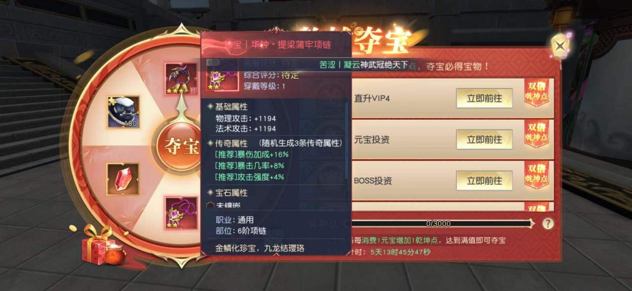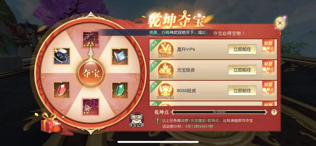 乾坤夺宝是一个转盘式的抽奖小游戏,需要拥有一定的乾坤点数才可以进行乾坤夺宝,3000点乾坤点可以进行一次夺宝,有机会可以获得红色项链。另外充值VIP可以获得双倍的乾坤点数,活动有时间限制,各位神王要抓紧时间参加活动。
