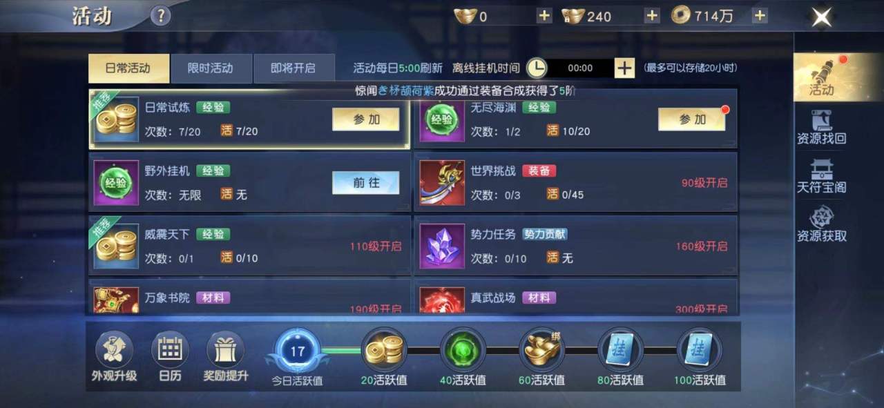 活动限制110级,进入后击杀一定数目的怪物后可以获得中型经验丹,这个道具可以无限次使用,获得的越多等级提升的越快,战斗力随之提升。